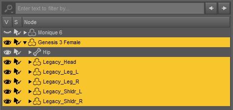 - (Optional) Apply the shape you want to the character.  In my case I will use SloshWerks's Genesis 2 Legacies product to apply Monique 6's head and body to Genesis 3 Female.  I also adjust Genesis 3 Female's scale to match that of Monique 6's scale parameter.