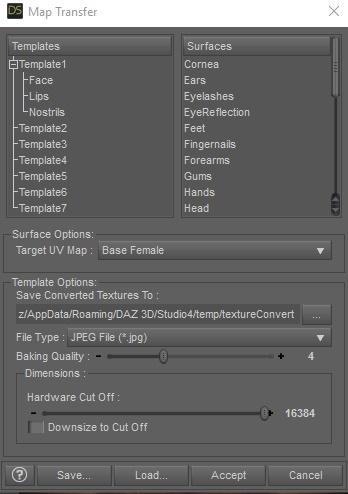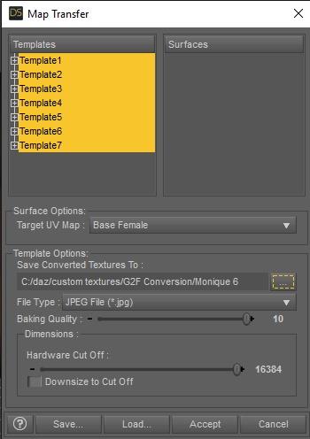 - Select all of the 7 templates.  Change Target UV Map to Base Female.  Set the Baking Quality to 10.  Change the Save Converted Textures To: path to the location of your choice.  Do not leave the default as it is a temporary folder that will be deleted.