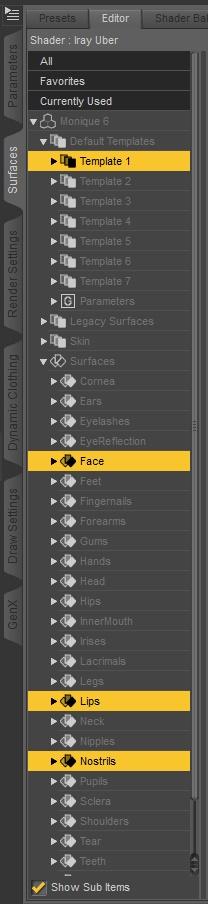 - Select Template1.  In the right use ctrl+click to multi select the surfaces Face, Lips, and Nostrils.  Drag and drop these over to Template 1.