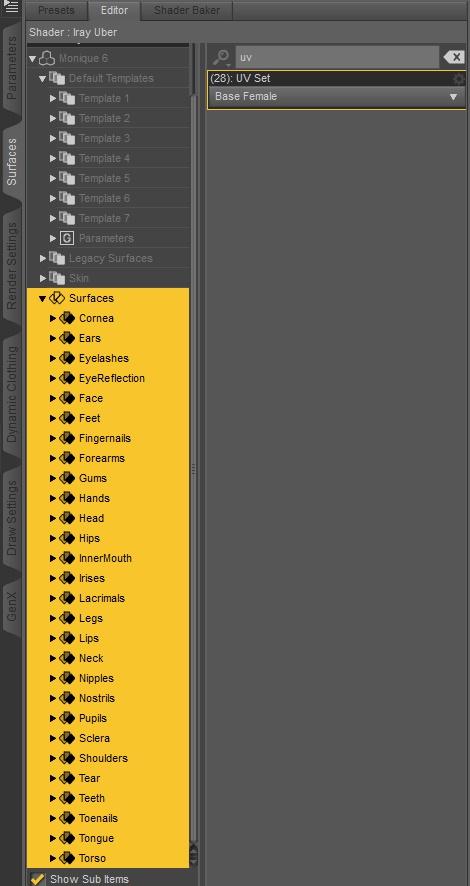 - In the Surfaces pane, select all of the surfaces and change the UV Set for the surfaces to Base Female.  The character should now look distorted or have visible black or white seams.