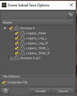 - On the popup, make sure your converted character is selected and all of the geografts selected as well and nothing else in the scene selected.  Click Accept.  In my example I have renamed Genesis 3 Female to Monique 6.