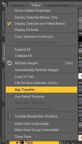 - Go up to the menu with the triangle next to the pane dock area and choose Map Transfer...