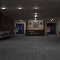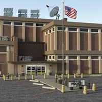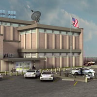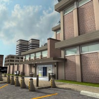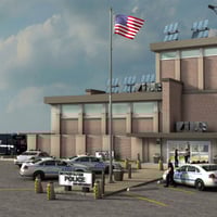 Scene includes walkway lights, an exterior garbage receptacle, and building height flagpole with an American flag. Parking stripes and tire stops are placed in the parking area of the asphalt. Herringbone pattern pavers follow the walkway. There is a patch of grass on either side of the entrance. There is also air filtration equipment on the roof,; as well as a large 10 foot satellite dish and solar panel receptors on the higher roofs. The basic design can be used for many different types of municipal buildings. The sign can be hidden for removed, or changed with any texture. Plenty of material zones make customization easier.