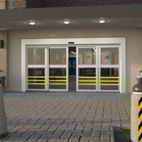The modern police station exterior has a large asphalt driveway and parking area with walkways approaching from both sides of the building, and includes the central lobby with reception desk which also includes the waiting area chairs, and restrictive signage. The double metal and glass sliding doors allows easy access into the building.