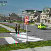 The residential road outside has traffic markings for pedestrians and stop signs to keep people safe. Both the picket fence and the board fences can be hidden or moved as necessary. The tall desidious trees on the front lawns are also included, with Daz instancing keeping them hidden until render time.