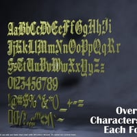 - Includes 3 different fonts with over 90 characters (uppercase, lowercase, numbers, and special characters) each: Sans Serif font, Serif font, and Gothic font