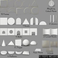 Abstract Sets is designed to allow you the creative freedom to set up and design your own backdrops, stage sets, and environments. Use any of the 41 props individually or use as many as you like to create scenes that are simple or complex. The Morphing Plane prop has morphs to deform and 18 different cutouts, allowing you to add paper-like foliage to your scenes. 28 Shaders are included to use on ANY item, and they can all be changed to any color in the surfaces tab. 10 preload Scene Subsets are included to allow you to render as they are or use them as a starting point to create your own scenes.