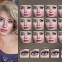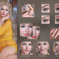 You can choose from 15 eye makeup styles with lipstick, 15 eye makeup styles with nude lips, fibermesh eyebrows, two styles of eyelashes, long nails option, french nails, a variety of nail polish colors, nails art, custom head morph, custom body morph, and three custom expressions: smile open, smile closed, and sultry.