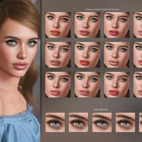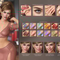 You can choose from 10 eye makeup styles with lipstick, 10 eye makeup styles with lips nude, fibermesh eyebrows, two styles of eyelashes, long nails option, French nails, a variety of nail polish colors, custom head morph, custom body morph, and three custom expressions: smile open, smile closed, and sultry.