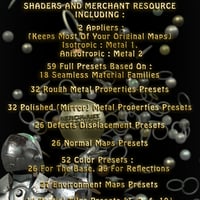 Advanced Metal Creator is a merchant resource, meaning that all content creators are allowed to sell all the props, figures and materials built using any of these Shaders Appliers, or even directly the Full Shader Presets themselves, as is, or customised. There are no limitations for content creators using the shaders relying on the maps they created themselves. For content creators willing to go faster and include directly some of the maps or Full Presets - eventually modified by the sub-presets included - there is a limitation of 3 full presets per product, or of a total of 21 of any of the included maps per product. See ReadMe for additional details.