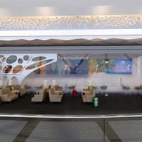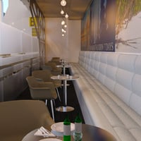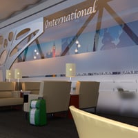 A lounge area in the airport with chair, sofa chair, round table, lounge side table, lamp fixture, lights, inner sofa, cart, tea cup, box, luggage, table setting and sign.