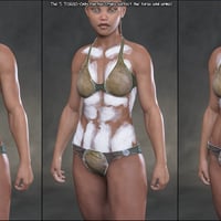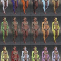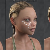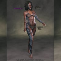 This package includes a whole-body-covering bodypaint with 10 full-body styles and 25 partial-body styles (5 each for face, head, arms, torso and legs). It also includes 2 complete decorative styles, Fantasy-Celtic and Tribal, with several partial body-options and some utility styles for lips, palms and soles.
