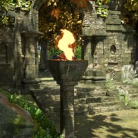 This detailed 3D environment features moss-covered stone ruins, dense leafy foliage, a sacred fire-lit archway, and enchanted forest ambiance perfect for storytelling, RPG scenes, or magical encounters.