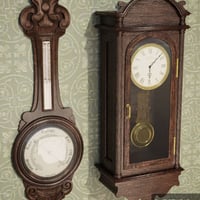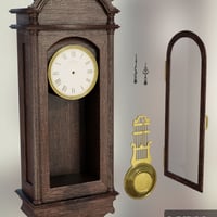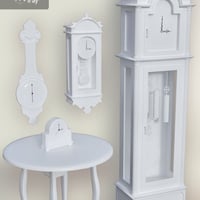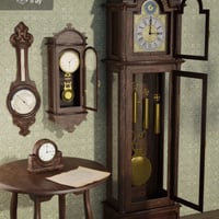 Antique clocks is a set of 3 old time pieces, including a Grandfather Clock, a Wall Clock and a Mantle Clock all with moving hands and pendulums, as well as a Barometer and a Table.