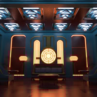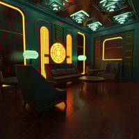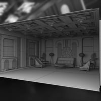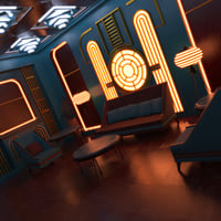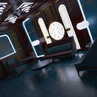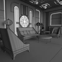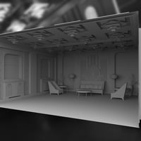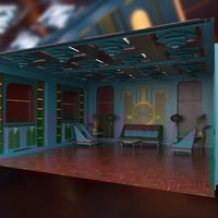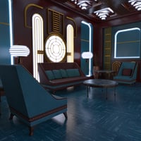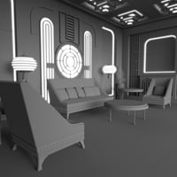 A utopian Art Deco inspired seating area, complete with two room materials. Sofa, tables, chairs, plants and lamp Props, with several camera and light pre-sets are included for extra customisation.