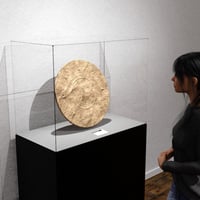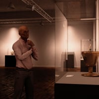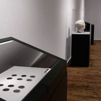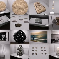 It features multiple paintings and sculptures, as well as archeological props such as ancient coins, a vintage box, prehistoric tools, etc.