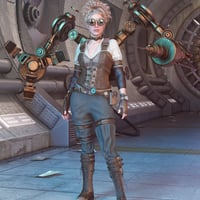 - A steampunk-inspired outfit with a mechanical arm backpack