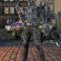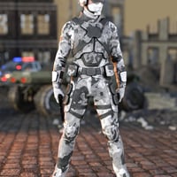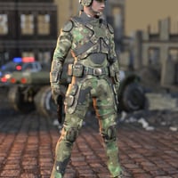 This full clothing set for Genesis 8 male(s) includes nine props (Armor, Bags, Helmet, Boots and more) and five IRAY Material Presets in Black, Futuristic, Camouflage, and Desert and White Camouflage.