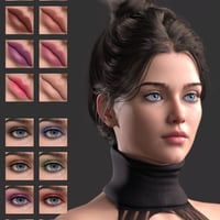 Giselle or Genesis 9 includes face and body shape, head and body HD details, PBR materials, 8 L.I.E. lip colors, 10 L.I.E. makeup options, eye color, fibermesh eyebrows, and normal maps.