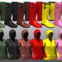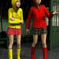 The Coat is modeled with two hoods , one in the up and other in the down position. There are two 'hide' materials are in place so you may easily switch between the two. The thigh areas for the Rain coat are not rigged for auto follow, they are instead controlled by movement morphs to ensure best results when posing. (animators please take note).