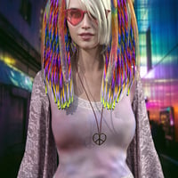 The Starter Bundle adds a bit of Boho style, which is combined with modern raver and music festival culture. Free flowing and colorful clothing options, bright and loud hairstyle, and a flamboyant pose set helps Babina express her free-spirited nature.