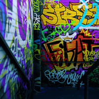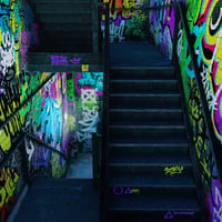 Nestled at the end of a narrow staircase, the walls are a canvas of raw expression, covered in layers of vibrant graffiti. The chaotic mix of colors and tags tells stories of countless nights and untold secrets.