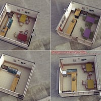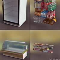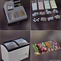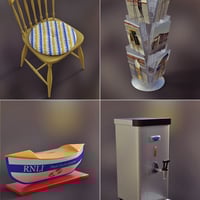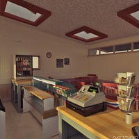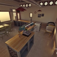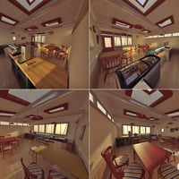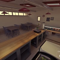 A detailed furniture set for the Beach Cafe buildings. Featuring seating, counter, freezer with contents, chiller and contents and other cafe themed items.