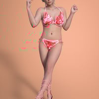 This outfit is a bikini set with a semi-transparent knotted shirt over it, and the shoes are Roman sandals for a comfortable and cool outfit for Summer.