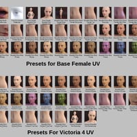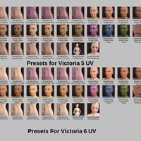 This set for Genesis 2 Female supports the Base, Victoria 4, 5 and 6 UVs with custom specular, top coat, transparency, and detailed normal maps that apply in one click over your existing materials for fast, beautiful Iray skin. Presets are included to show off your skins at their best at various specular and bump settings, plus full presets for different tints and colorful skins!