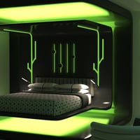 Bed Pod Future, is a cool, calm slick futuristic version of our beds. Neon glows and reflective colours, geometric shapes and simple lines. Not a hair out of place.