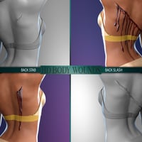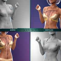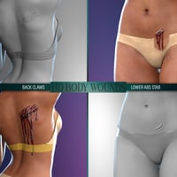 "Body Wounds HD Morphs for Genesis 8 Female(s)" is a collection of 24 open body wounds created through the careful combination of HD morphs and LIE material presets for flesh texturing and optional blood layering. In addition, we have included a mirror option for 18 wounds, rounding it up at 43 HD Morphs.