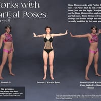 Introducing the revolutionary new way to use poses from different figure generations! Stop wasting time and hard drive space converting pose presets, just use them! With Bone Minion, you can directly use poses for Genesis 2 Female and Genesis 2 Male without first converting and saving them to a preset. Your Bone Minion will do the hard work for you by acting as a bone "catcher" for a pose and then transferring (and converting if necessary) the pose to its parent Genesis 9 Figure. Simply load the desired Bone Minion (i.e., Genesis 2 Female Bone Minion for Genesis 2 Female poses) on your Genesis 9 Figure, select the Bone Minion, and start applying poses!
