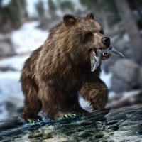 The majestic and fierce brown bear, reproduced into a remarkable 3D model and original figure with detailed textures, exceptional fur and lot of morphs, controls and poses, and 3 different color schemes, and a rigged salmon 3D model.