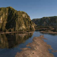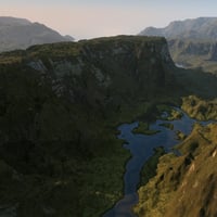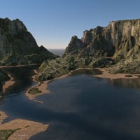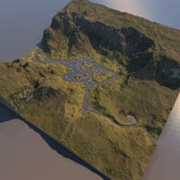 Once scene holds the DTE generated terrain. The five remaining scenes show how this can be employed with a material mapped specifically to this terrain to give the impression of a river bed or shore. Important Note. These are demanding scenes and are processor intensive, particularly the one which includes volumetric clouds. Do not expect instant results.