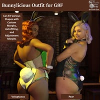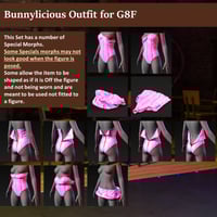The Bunnylicious outfit is a Retro styled cocktail waitress uniform consisting of 3 Figures, Suit Cuffs and Collars and an number of props including a Bunny Tail and Bow Tie.