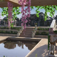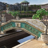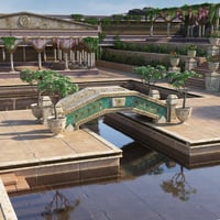 The Byzantine Terrace is a detailed environment that includes a landscaped space, decorative buildings, and a swimming pool with a bridge over it.
