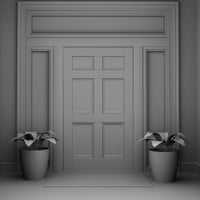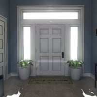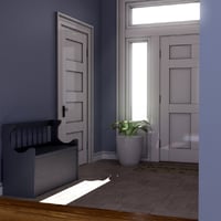 The set includes the walls, a floor with a step down into the foyer, and ceiling meshes of the main room along with plants, a bench, a side table, and a shelf with coat hooks and storage cubbies, and a welcome mat.
