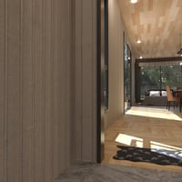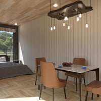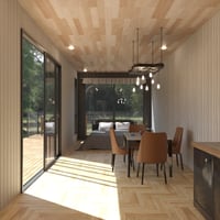The warm wooden textures, industrial metal accents, and soft ambient lighting create a perfect balance of comfort and sophistication. Large sliding glass doors open to a spacious deck, inviting natural light and an airy feel.