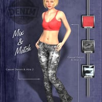 Casual Denim 2 Xtra is a Daz texture expansion set for to the Casual Denim 2 clothing set. It includes three texture sets for the shoes, five for the jeans and ten for the top.