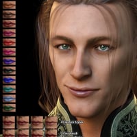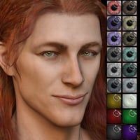 Acacios has 22 eye material options, which include 14 regular eye colors, 7 solid eye colors, and a black pupil option for the solid eye materials. He has 3 eye makeup options, as well as 2 full-body makeup options with 10 color presets. His full-body makeup options are also available as geoshells so they can be stacked easily and used on any character. He has 14 lip color options available in 4 shapes: full, soft, subtle, and understated. There are 3 shine options available for each of the shapes: base, matte, and wet. He also has a shimmer lip option for any of the lip colors and 5 levels of coverage.