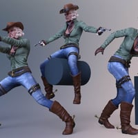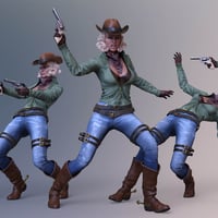 CDI Poses for Genesis 8 Female and Honni 8 include 20 gunslinging cowgirl poses (10 are H-poses utilizing the fancy revolver from Old West Firearms Vol 2) and 7 slicked up expressions for all your weird or wild west adventures.