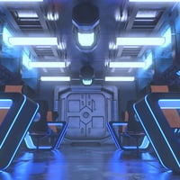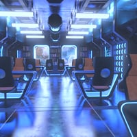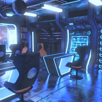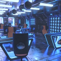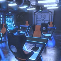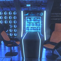 Set contains chair, short table, long table, walls with Holographic shelf, duct, ceiling lights and room walls.