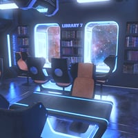 Inside the spacecraft’s Celestial Reading Room, silence hums with distant engines and drifting starlight.