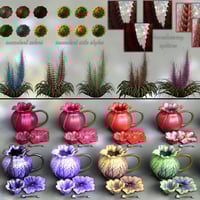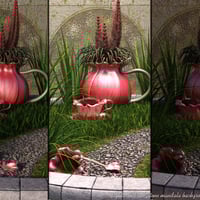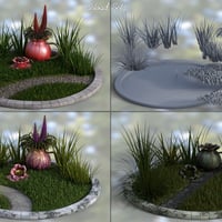 The set includes 3 full preload scenes, but you can set the pieces as you wish. It comes with grass, a road with multiple positions, corresponding filler grass with several morphs, a succulent, a full tea-set complete with a teacup, plate, pot and even a spoon, plus a unique fairy flower. All items have several material options so you can set the place as you desire. All pieces are good for close up renders. Please see promo images for more details.