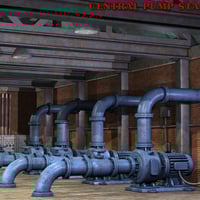 Highly detailed industrial pump station with movable roll-up door, two movable doors, 6 movable fans, twelve hide-able body parts and a Poser light set.