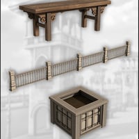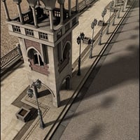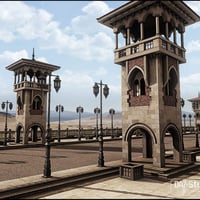 Cheirocrates is a modular exterior set, featuring various elements inspired by an Arabic-style avenue. This 3D scene includes a fence, planter, bench, street light, tower and three tiling ground sections. Also included are two section preloads to get you started quickly, or you can use the individual pieces to create a variety of layouts.
