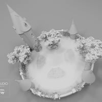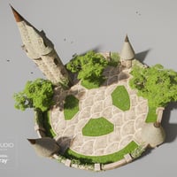 A detailed fantasy scene of circular walled enclosure with tower and 3 conical doorways. All doors open and the walls can be hidden for better camera access. Includes separate high density grass, planting and trees.