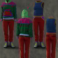 This contemporary clothing set comes with a tank top, pants, sneakers, and two hoods (one open and one closed).