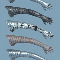 This package contains two separate arm meshes and five MAT pose presets. The banding on the arms is accomplished through modeling and not through bump or displacement mapping, though texture maps are included to add a sense of age and wear to the arms.