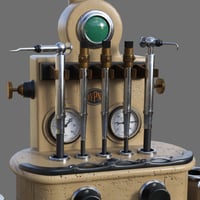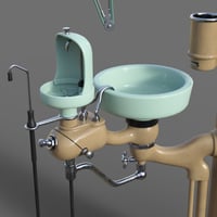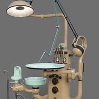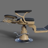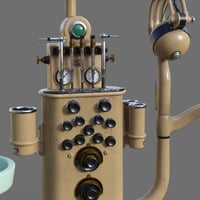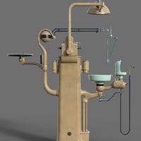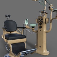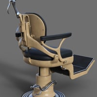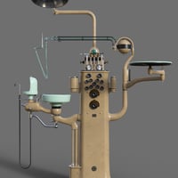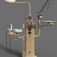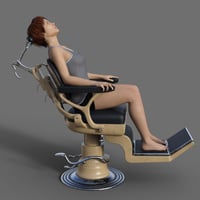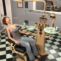 Dentist chair and workstation props. Step into a bygone era with this intricately designed dentist chair and workstation, where industrial precision meets art deco elegance. The dentist chair commonly seen in dental clinics from the 1930s to 1960s era is rigged for full functionality and can be adjusted to many positions to fit the person sitting in it and adjusted to optimal working positions. Included in the set are convenient chair poses for upright and reclined positions as well as a footrest tilt position. Featuring along side the chair is the dentist workstation, combining multiple tools together on a conveniently accessible tower, rigged elements include cuspidor, dials, drills, gauges, lamp, saliva ejector and tray. Wearable chair presets for Genesis 8 and 9 figures place them in a standard sitting position on the chair.